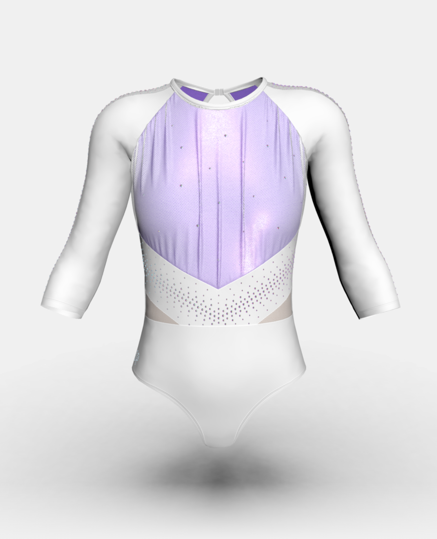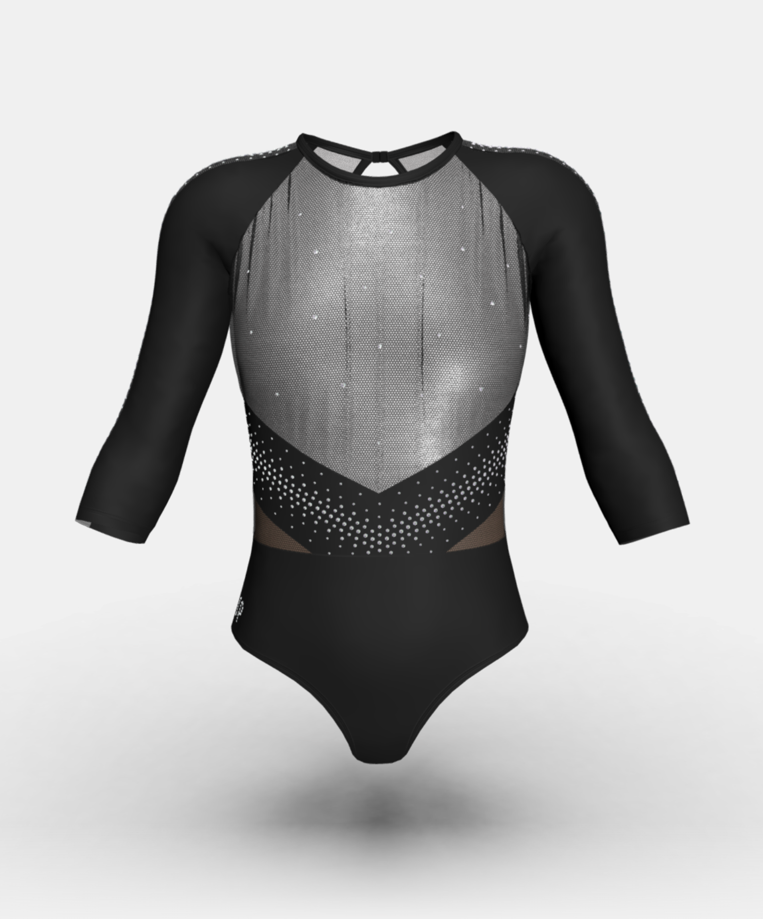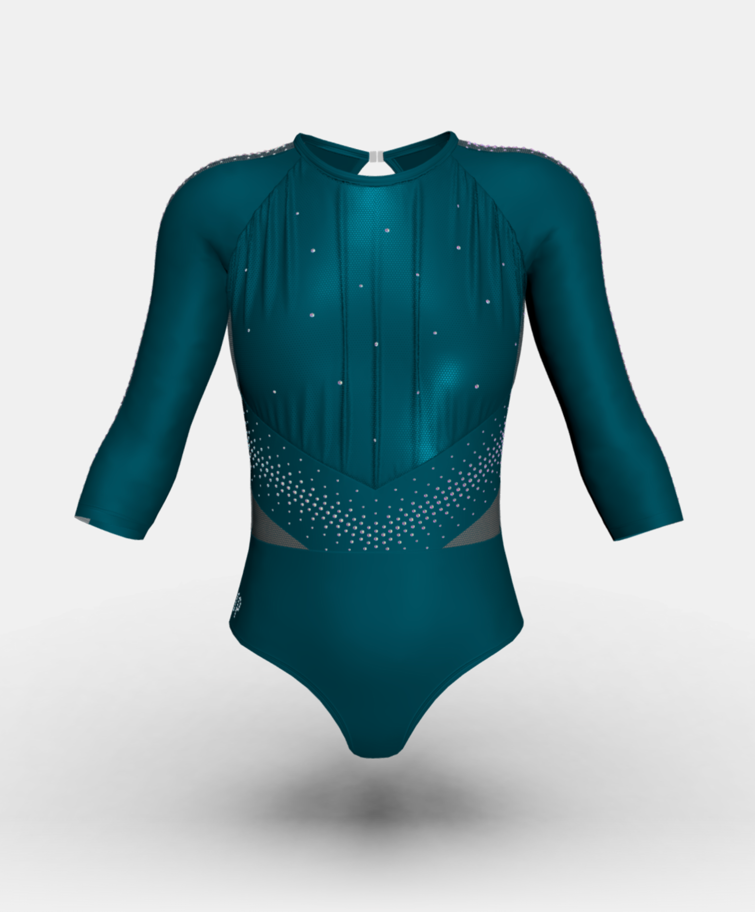 A revolutionary design that oozes sophistication. The Willow leo cleverly combines a double layer mesh gather with a subtle sheen shining out from underneath. The sleeves have been modelled in a raglan sleeve shape with expertly placed panels and engineered crystal linework running through the center. The lower body and belt panels are crafted from a matt lycra fabrication, whilst the mesh cutouts are skin lined to ensure complete coverage. The crystals are iconic and command attention.