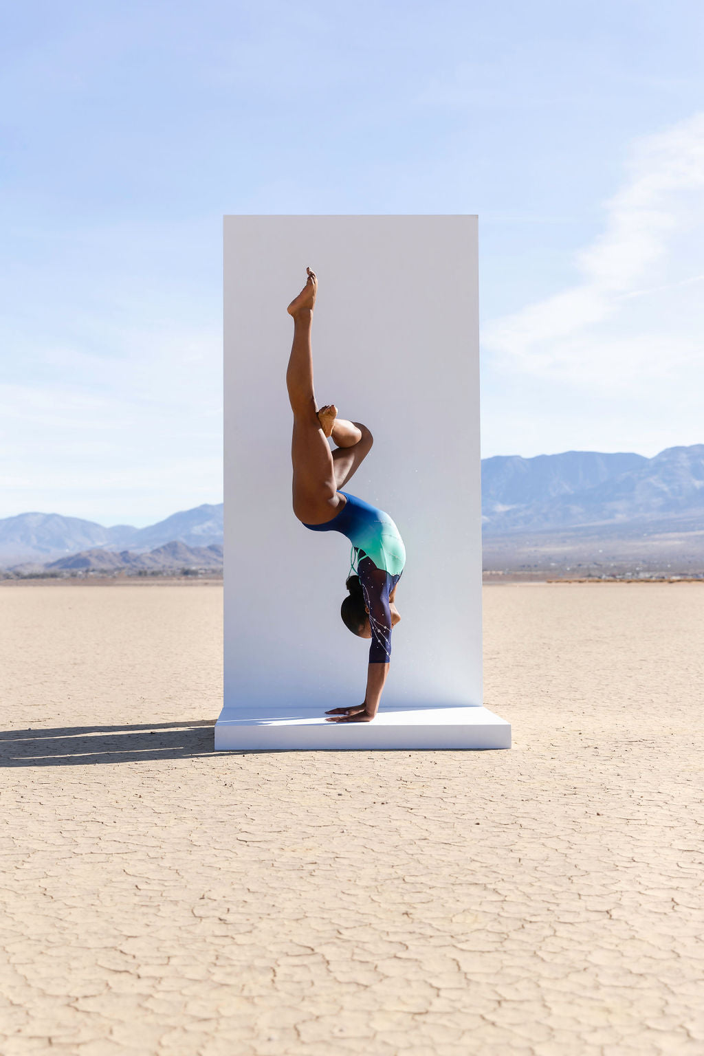 Reminiscent of free-flowing water the Takura design feels ultra feminine with a cascading, symmetric ombre design that is abstract and sensorial. Styled in a higher round neckline with a clasp at the back neck and asymmetric strap detailing, ensuring complete compliance. A subtle diamond-shaped mesh panel peeps through the side body for an extra touch of drama. Transmission crystals melt into the body and sleeves in swathes of irregular lines. Embellished with crystals by Swarovski®.
