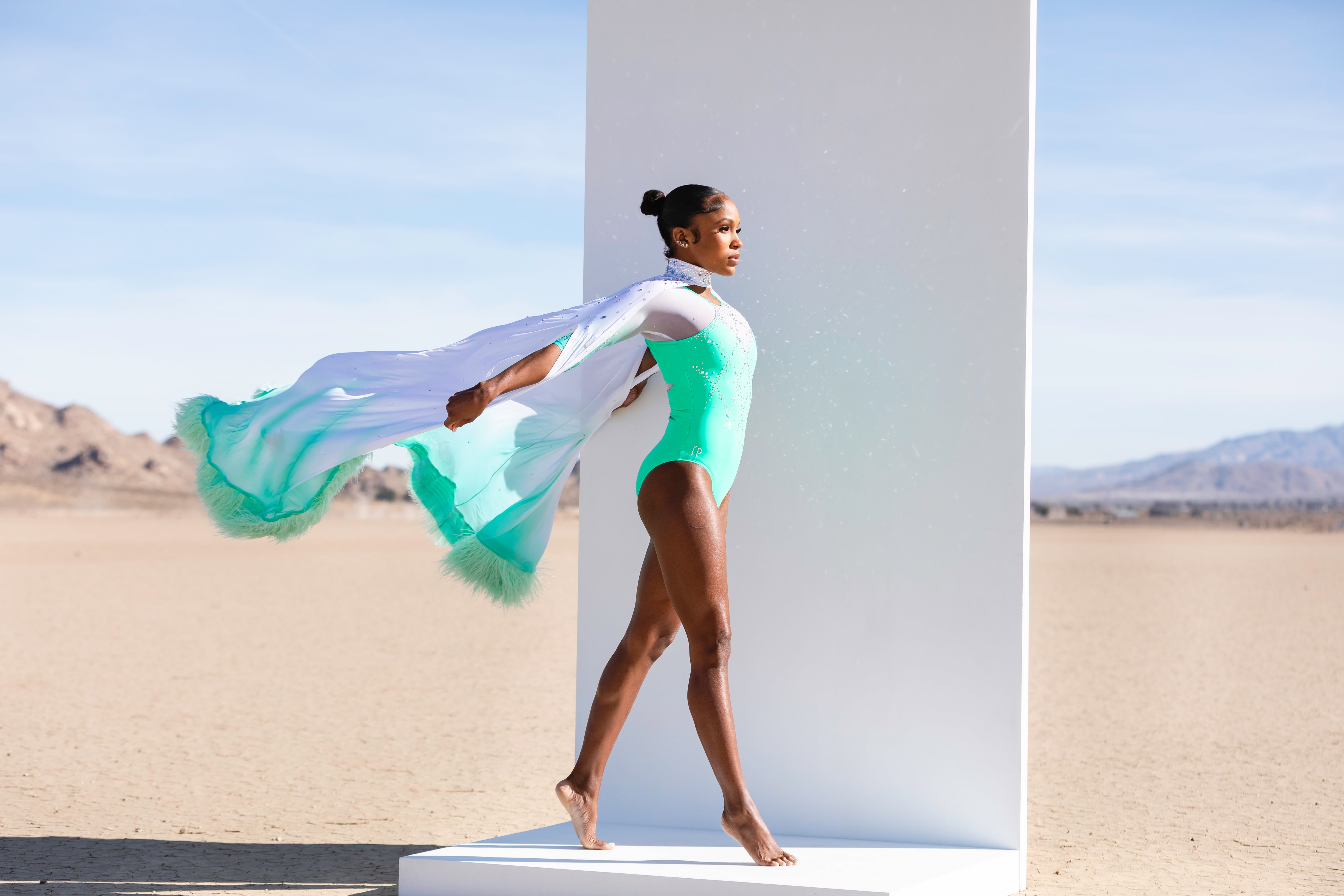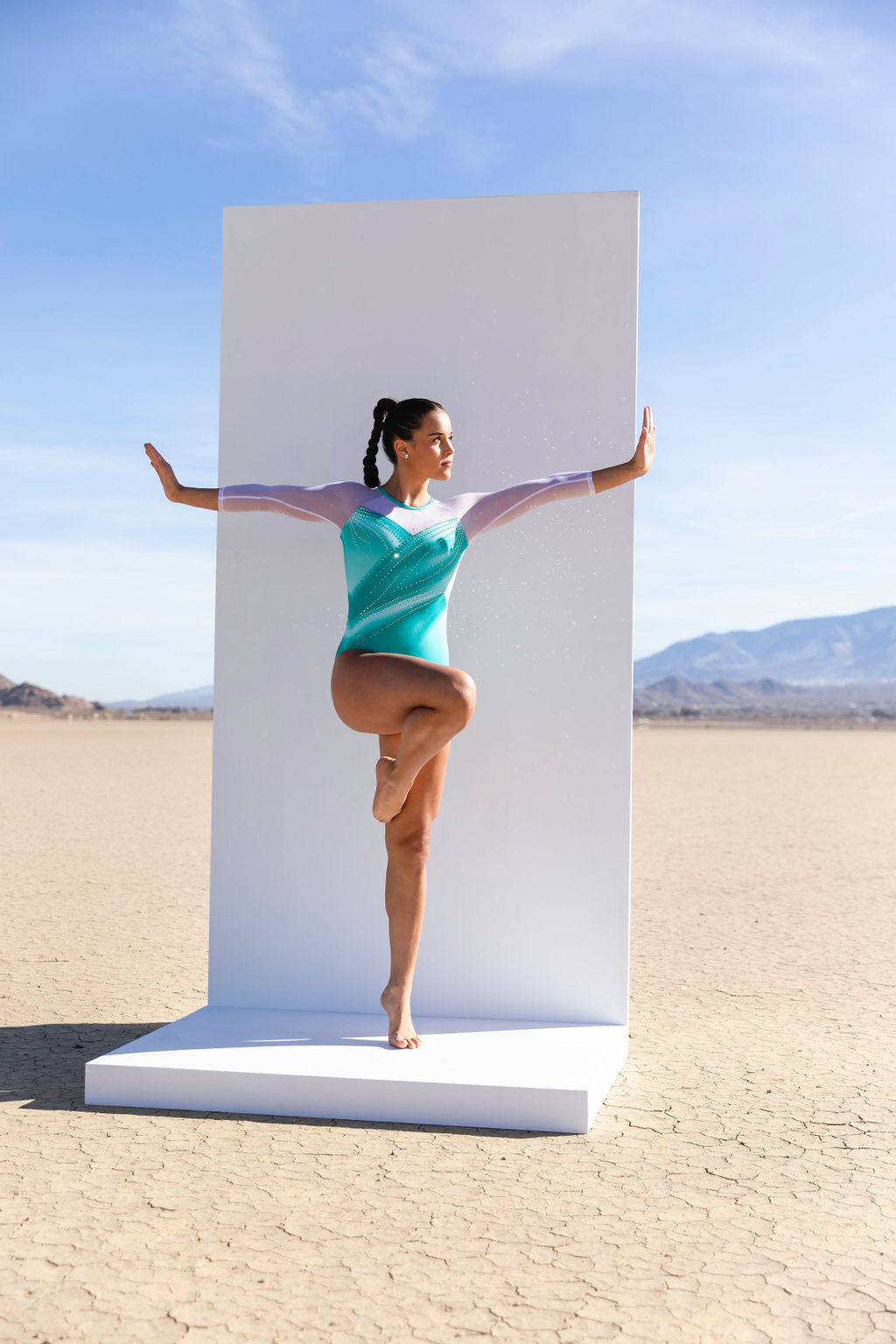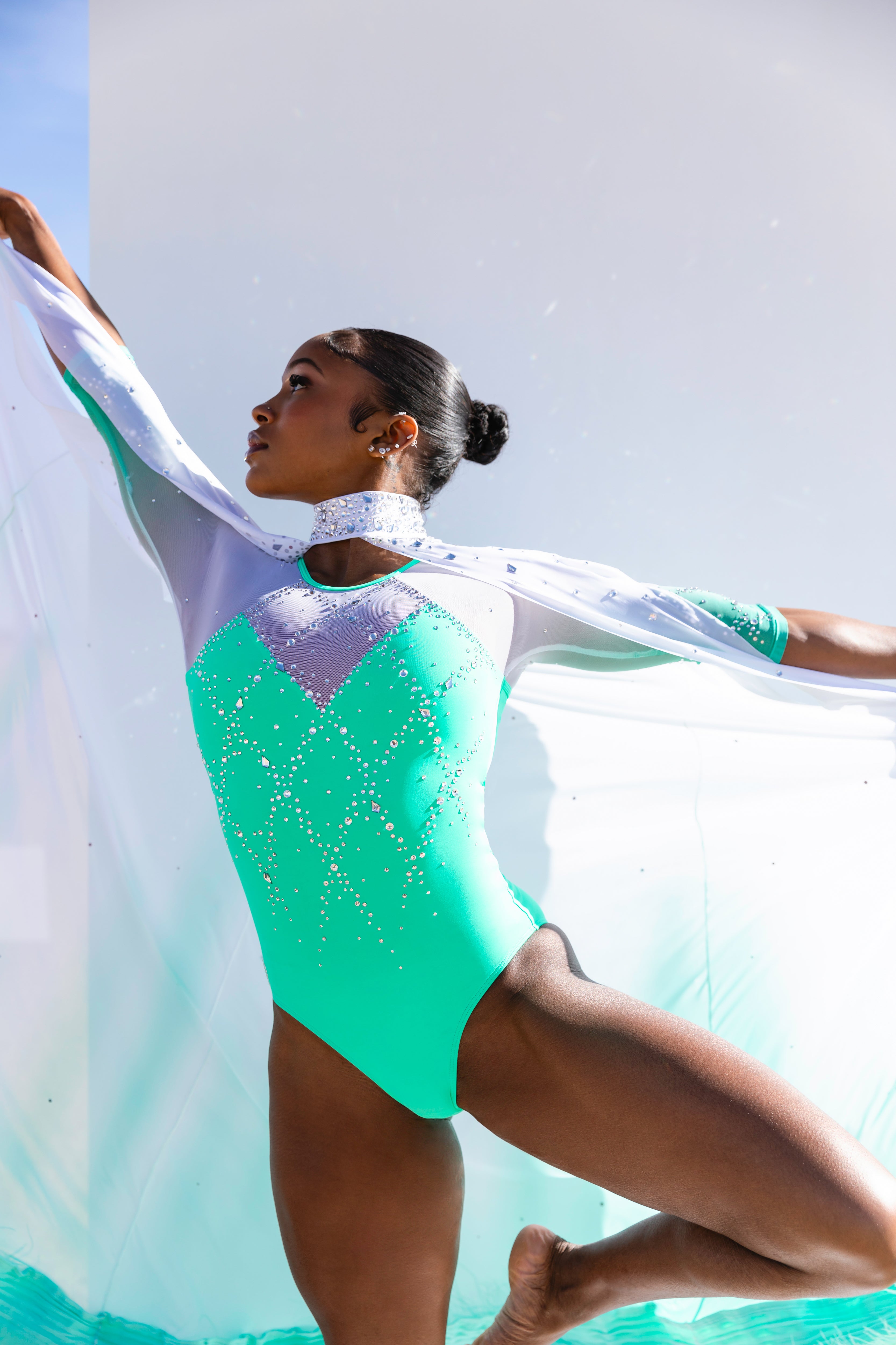 Design mastery at its finest – the Charla leo is a double-layered look and a signature editorial teamwear style, ready to stand out on the floor. Styled in a V-shape halter neck outer layer with a round mesh underlay through the front. A clasp at the back neck allows ease of movement with one-of-a-kind cut-outs and strap detailing. A straight belt detail in mystique draws the eye. Clear crystals are delicate yet magnificent, with pear, kite and navette shapes adding to the grandeur of the couture look. Embellished with crystals by Swarovski®.
