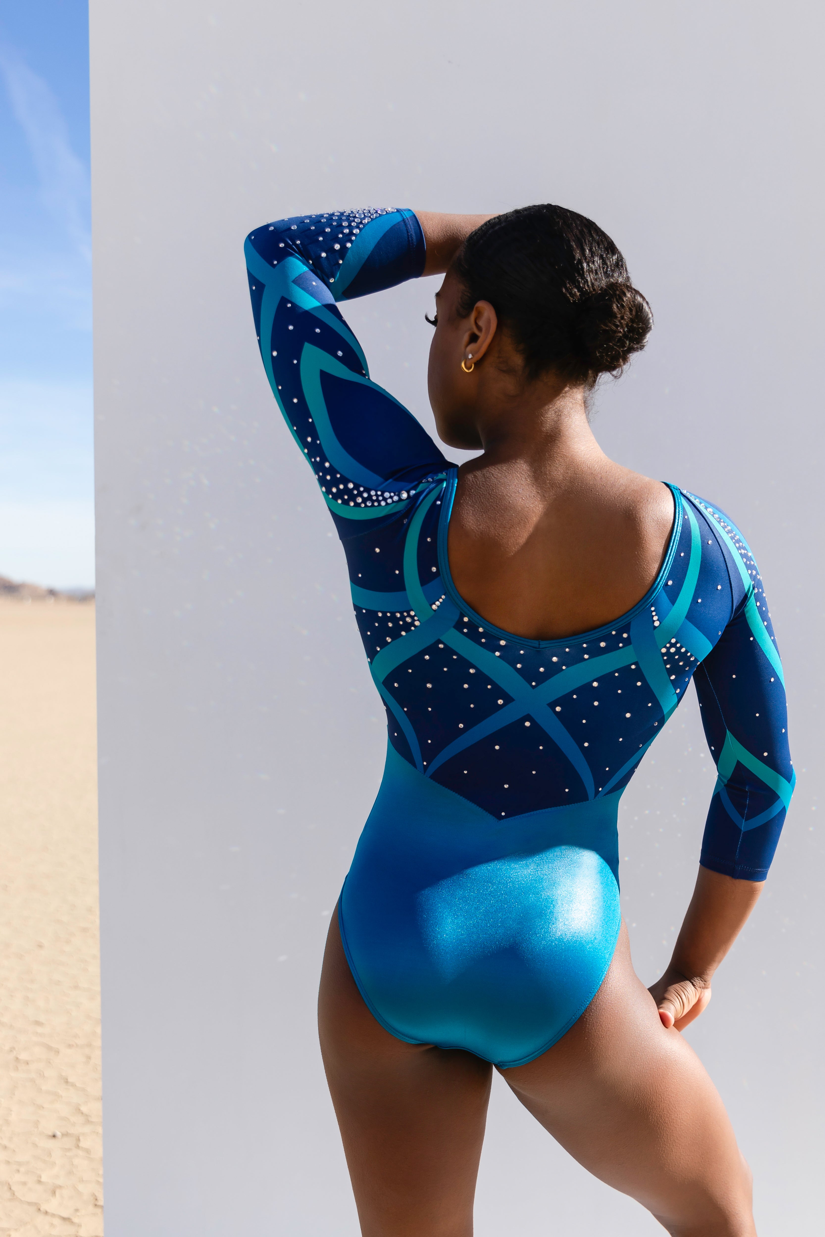 gymnastics – the Kenzi design dares to be different. Styled in a round neck line at the front with a V-shape at the back. The upper bodice and sleeves are sublimated with an ombre ribbon-like look. A waist accenting V-line is created through the body with a textured
