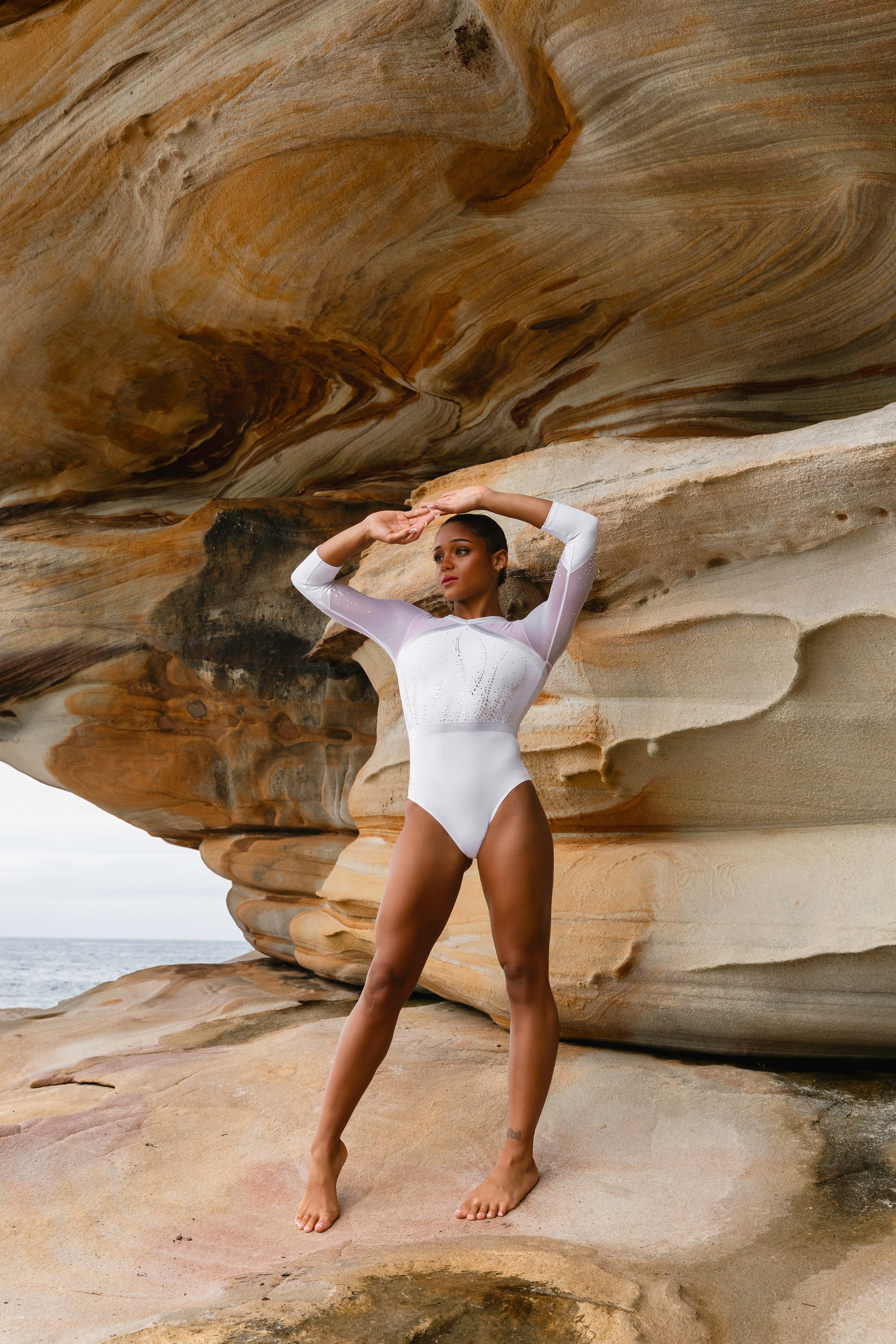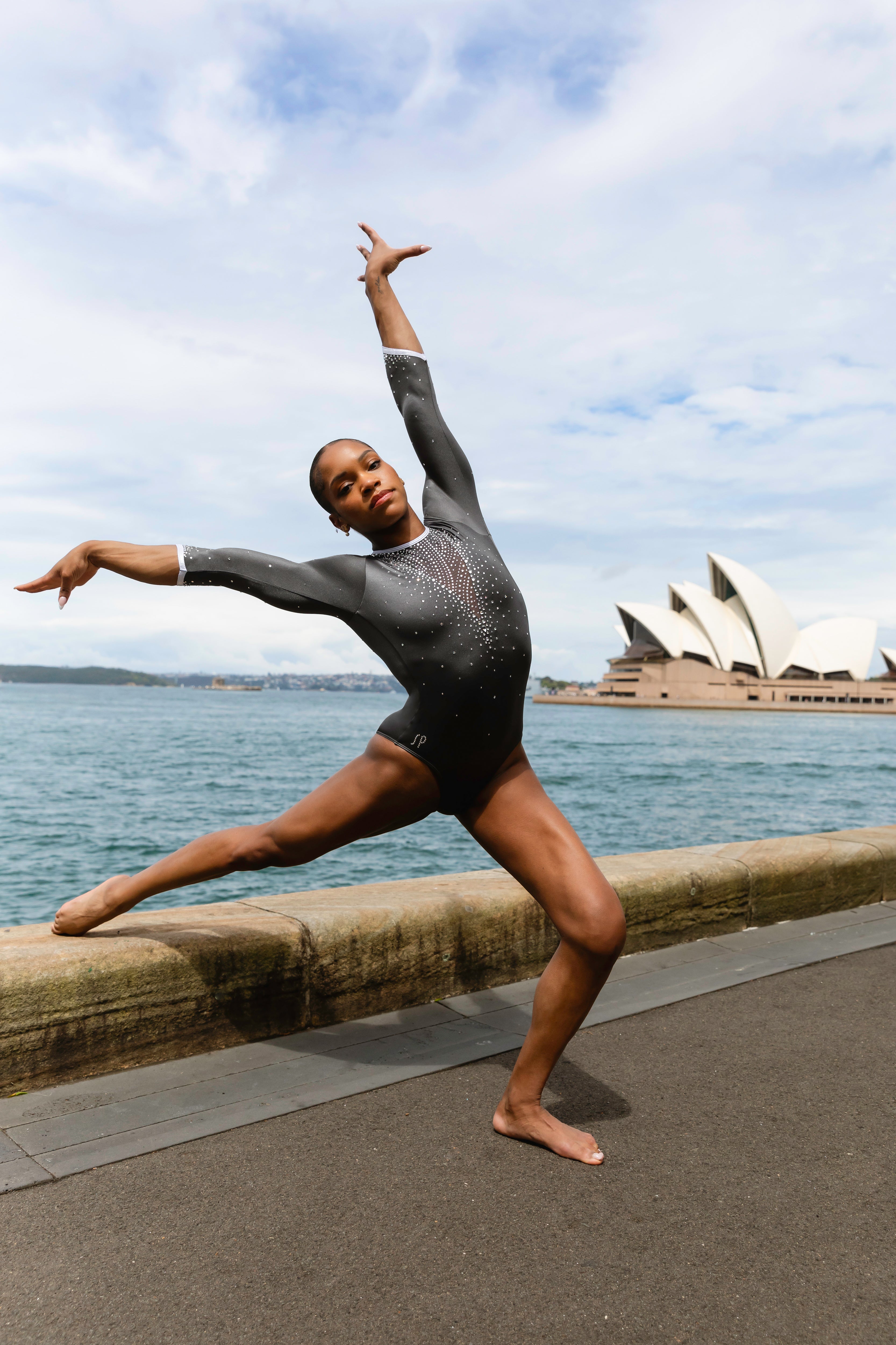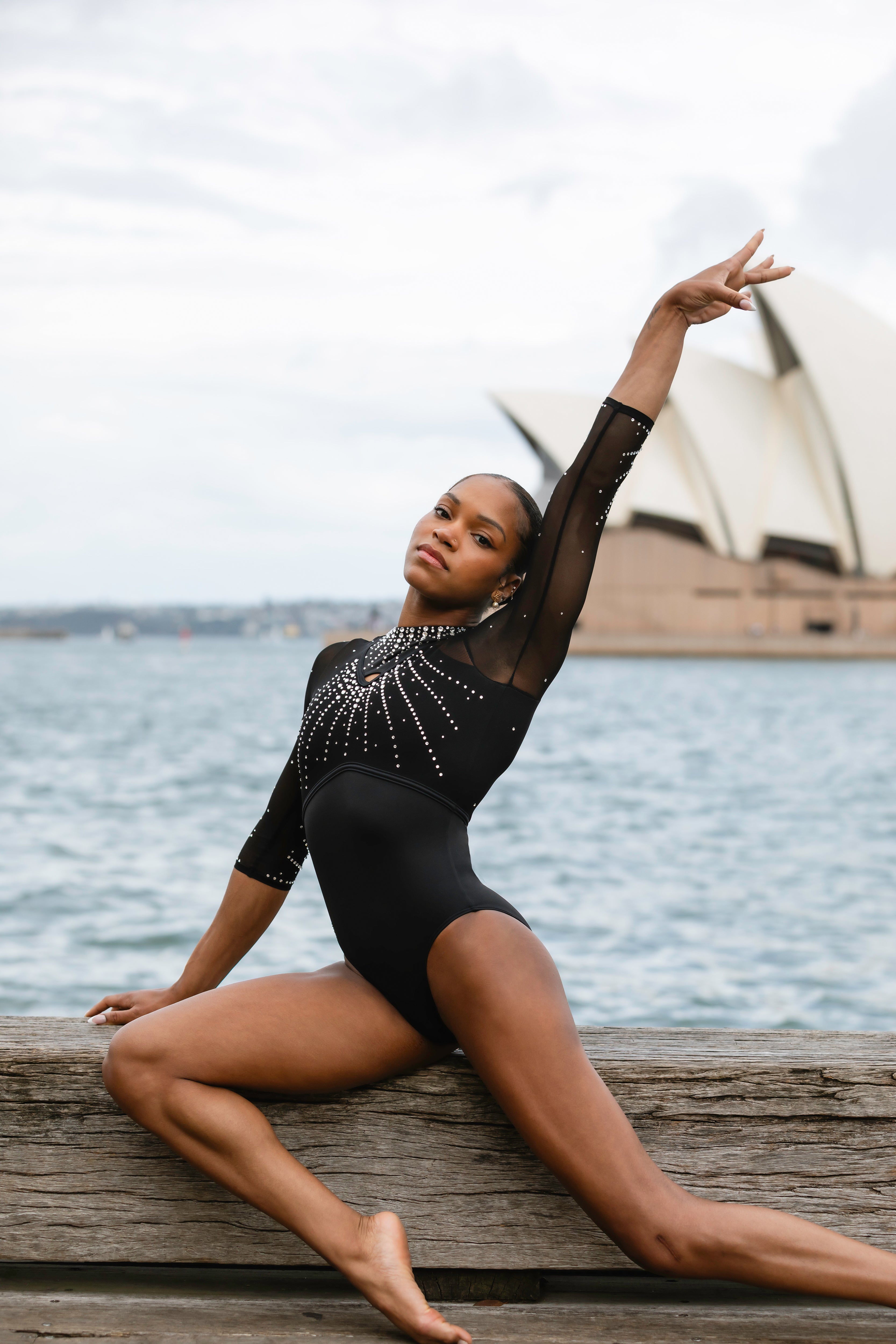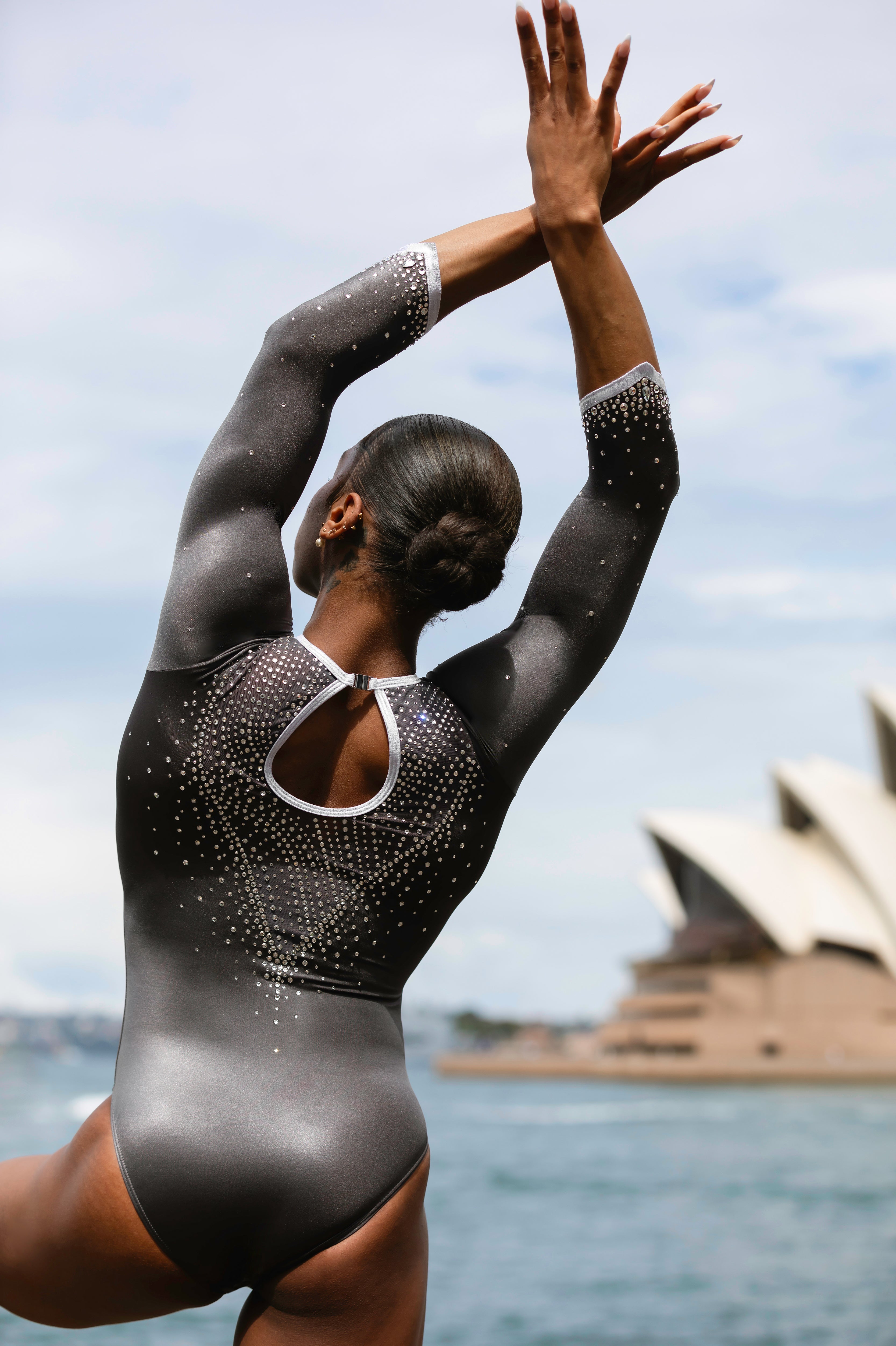 Inspired by Shilese Jones's Fearless competition leotard from 2024. The Aisha design shows how our design intelligence is unmatched. A uniquely original double layered-look neckline with cut-outs shows off-shaped bodice panelling. This design is all about showcasing textural fabrications. The Upper bodice is cut from matt lycra with a mesh overlay. Clear crystals radiate out from the neckline in strong architecturally designed lines. Embellished with crystals by Swarovski®.