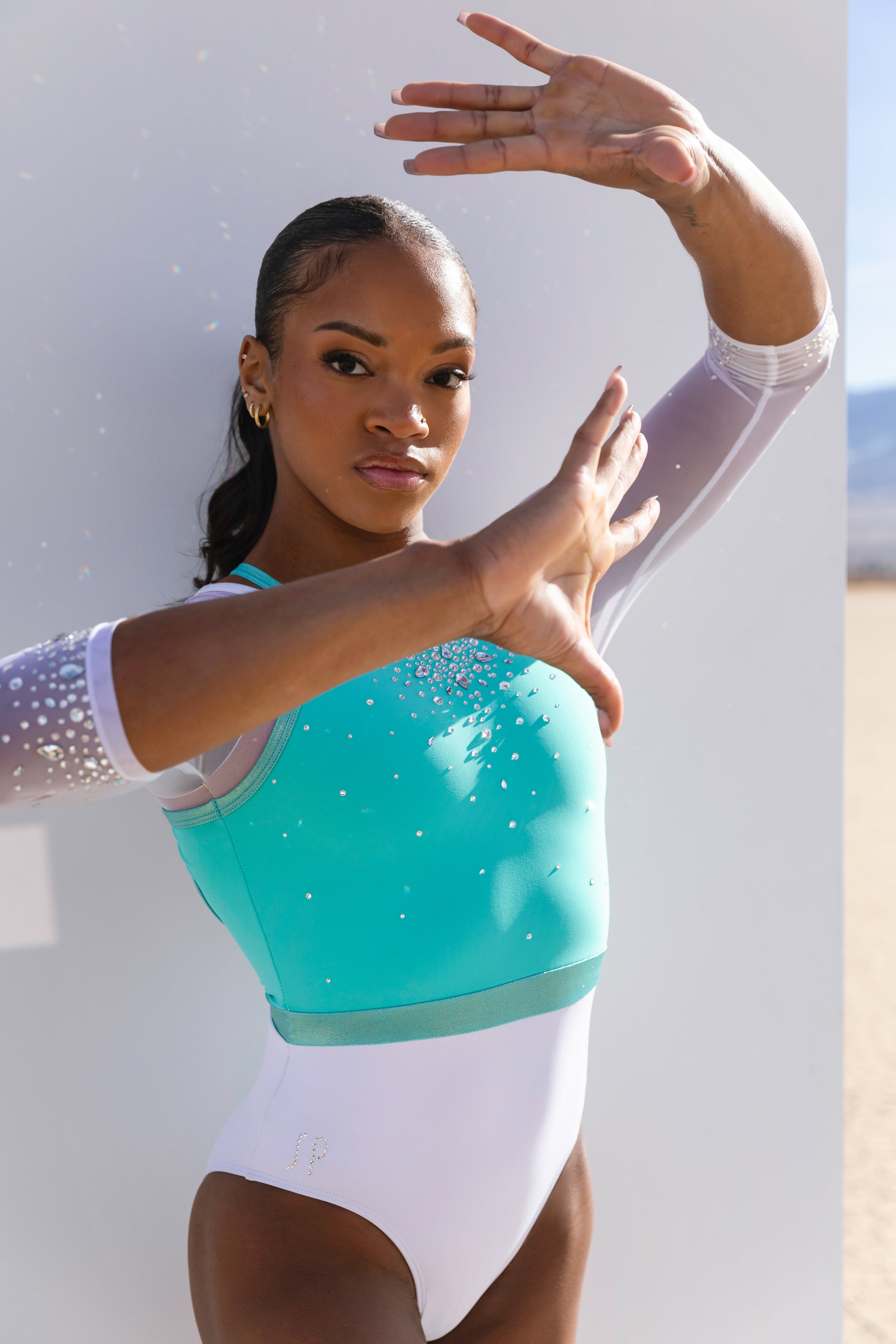 Design mastery at its finest – the Charla leo is a double-layered look and a signature editorial Teamwear style, ready to stand out on the floor. Styled in a V-shape halter neck outer layer with a round mesh underlay through the front. A clasp at the back neck allows ease of movement with one-of-a-kind cut-outs and strap detailing. A straight belt detail in mystique draws the eye. Clear crystals are delicate yet magnificent, with pear, kite and navette shapes adding to the grandeur of the couture look. Embellished with crystals by Swarovski®.FABRICATION DETAILS: