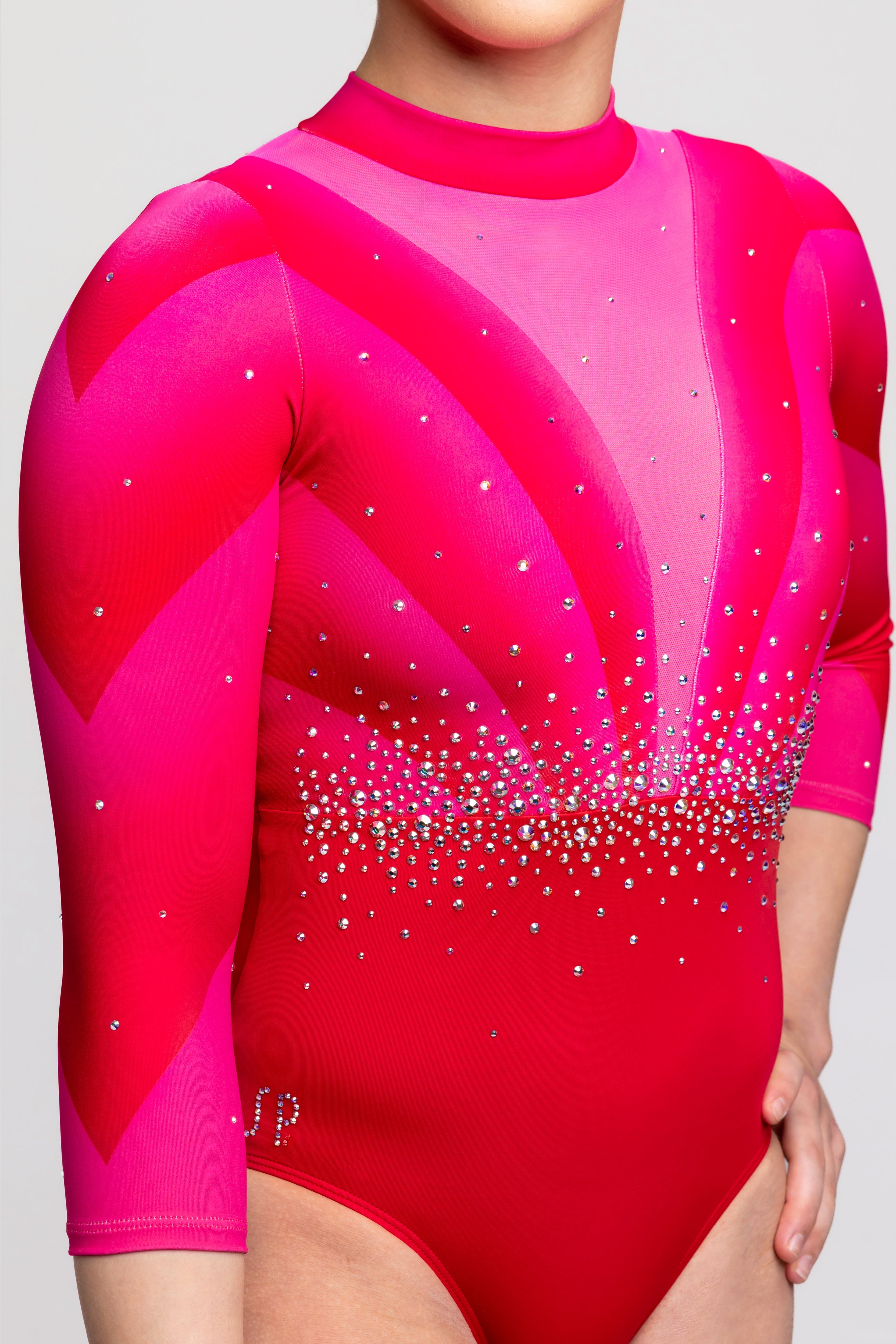 Standing strong with a mood-boosting creative flair—the Ember design is a style statement. Fashioned in a high neckline with a collar, the upper boasts a sensorial two-colour ombre effect with deep mesh panelling that accentuates the design lines. Through the back, a deep-V panel is accentuated with delicate criss-cross straps, clasp & keyhole for ease of movement—the sleeves also feature the same dynamic ombre print for a unique look. Hyper sparkling crystals encrust the mid-section in a glamorous design while the sleeves feature a crystal scatter. Cut from a combination of our signature printed stretch fabrication upper & sleeves that has a matt finish & soft hand feel plus matt lycra lower with mesh panels. The front of this leotard is fully lined for complete athlete comfort with upper mesh body panels fully lined with skin lining for zero transparency.