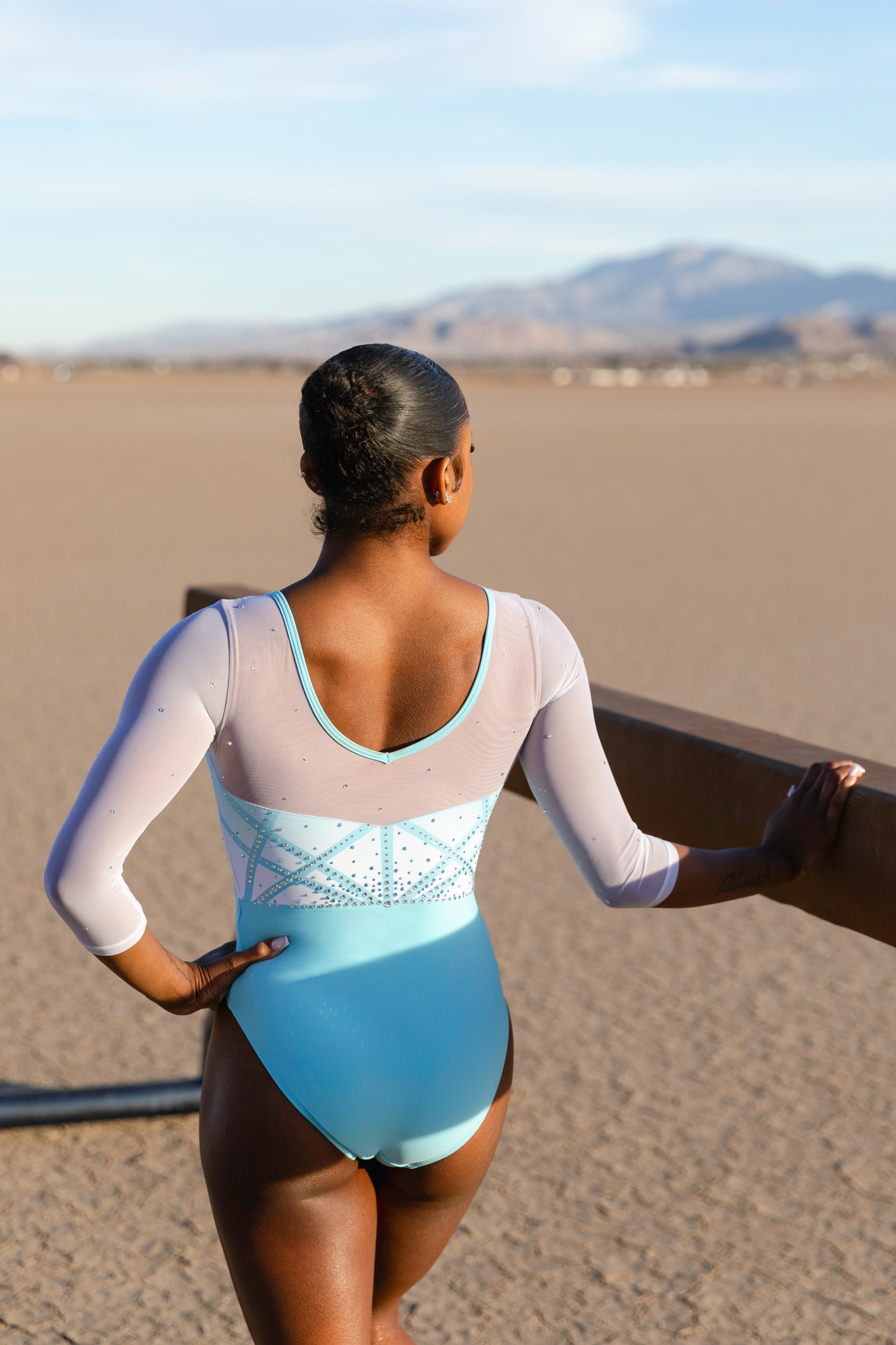 Ever changing—the Jessa design is simple and sweet. Styled in a V-neckline front and back with angular sweetheart panelling to keep it classic. The sublimated ombre design is the real star, melting into the linework, creating a metamorphosis effect to the colour. Clear and Aquamarine AB stones flow with the ombre design lines, giving a modern and iced effect. Crystals scatter over the upper chest and sleeves. Embellished with crystals by Swarovski®.