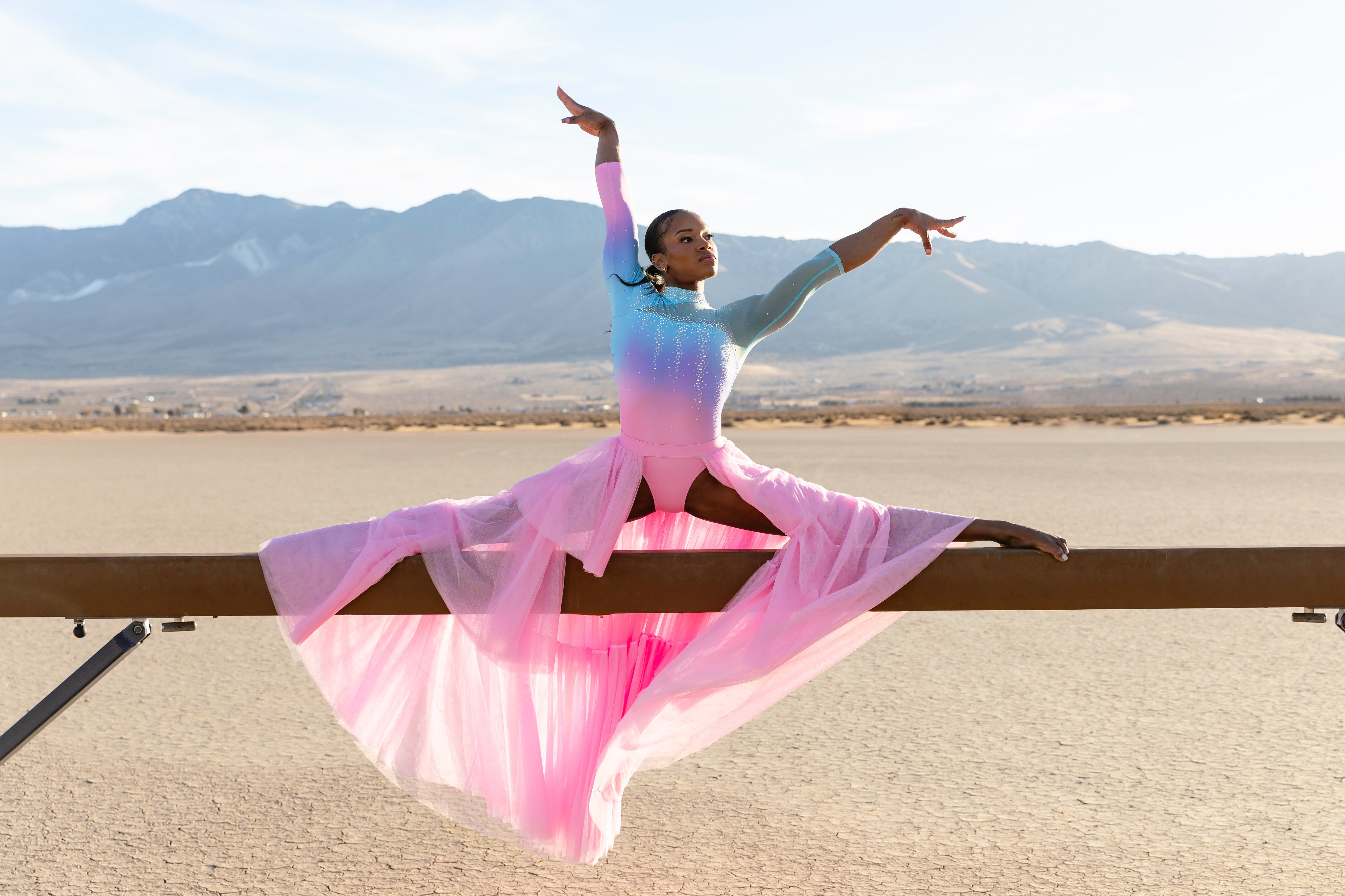 High fashion and editorial—the Shi leotard was inspired by Shilese Jones’s 2023 Championships look of the same design. Styled in a high neck with a neckband and clasp at the back, the asymmetric design flows with the body.