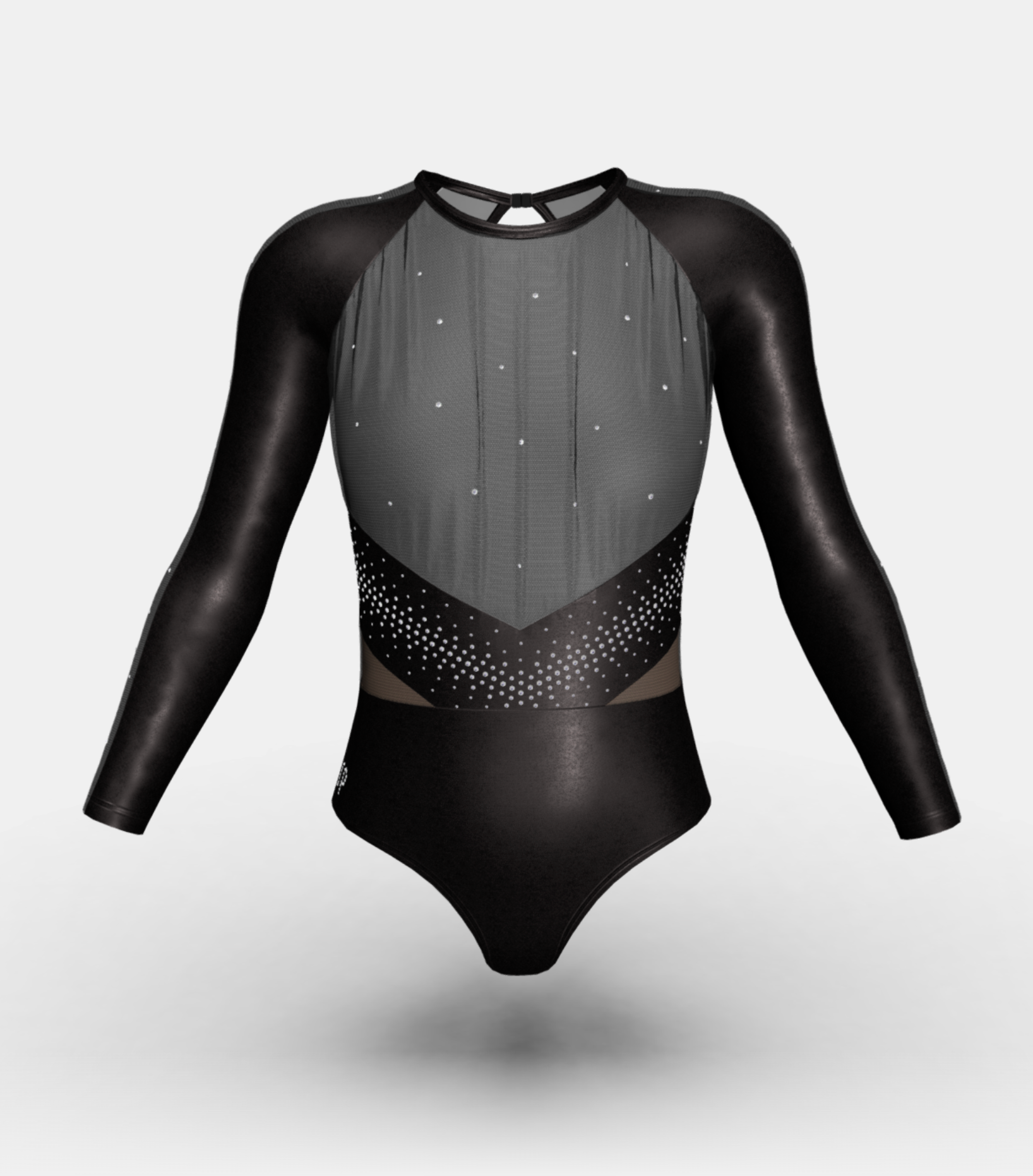 A revolutionary design that oozes sophistication. The Willow leo cleverly combines a double layer mesh gather with a subtle sheen shining out from underneath. The sleeves have been modelled in a raglan sleeve shape with expertly placed panels. The lower body and belt panels are crafted from a matt lycra fabrication, whilst the mesh cutouts are skin lined to ensure complete coverage. The crystals have been engineered as a front crystal belt with a light scatter on the sleeves on chest.